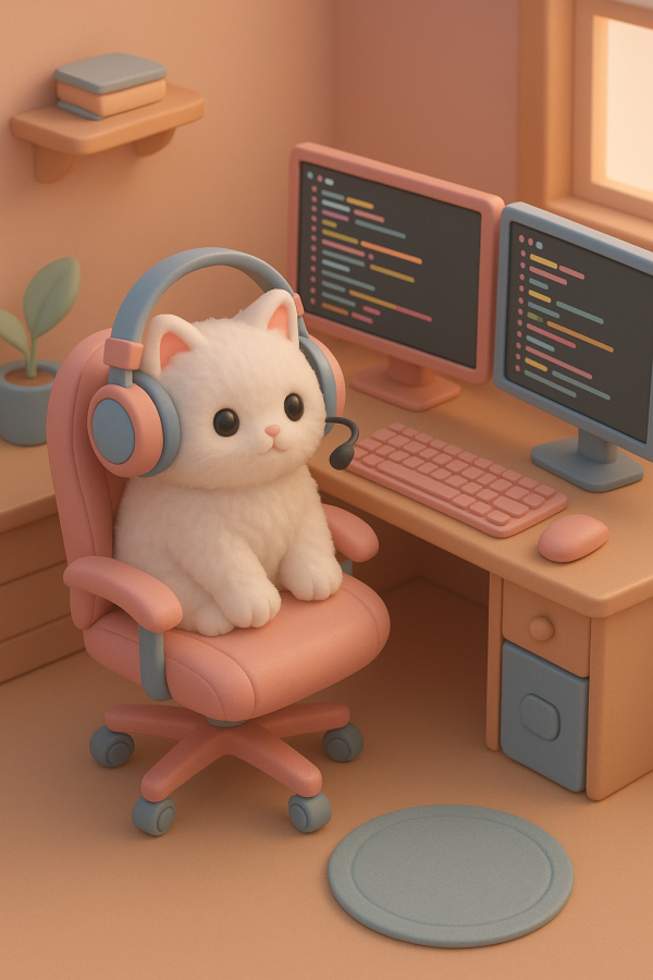 Cute isometric gaming room, a fluffy white cat wearing headphones sitting on a gaming chair, computer screens with code, pastel colors, soft lighting, cozy atmosphere, 3d render, blender style, c4d, clay material, high quality, adorable, detailed.