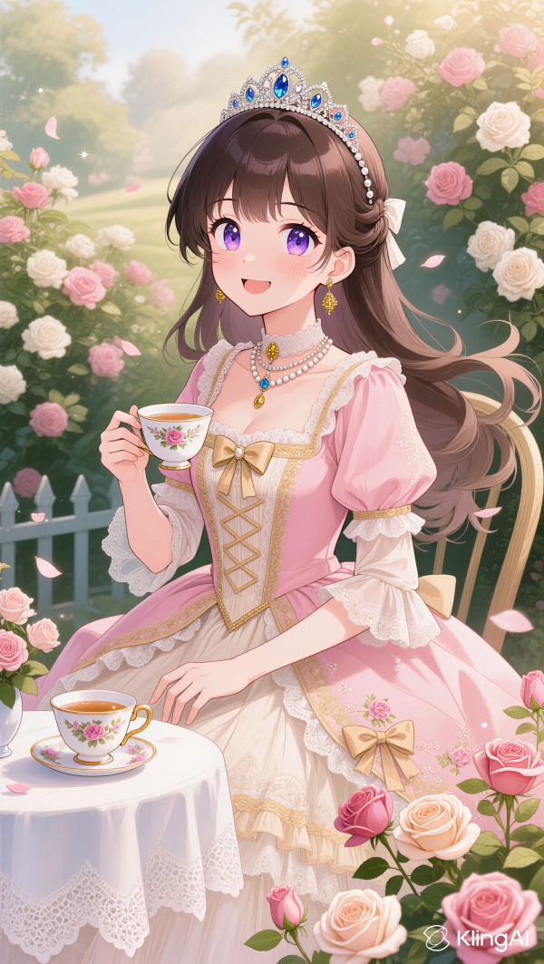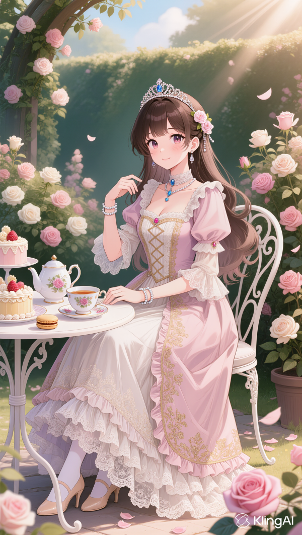 Beautiful noble lady in a luxurious rococo dress, jewelry, tiara, tea party in a rose garden, sparkling eyes, fluttering hair, flowers blooming, shoujo manga style, Korean webtoon art style, illustration, soft pastel colors, dreamy atmosphere, intricate details, golden light, high quality.