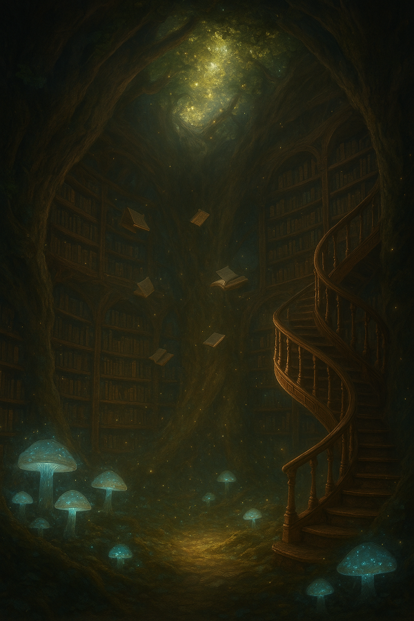 A majestic magical library inside a giant hollow ancient tree, glowing mushrooms, floating books, fireflies, mystical atmosphere, sunlight streaming through leaves, wooden spiral staircase, intricate details, fantasy art, digital painting, trending on ArtStation, 8k resolution, cinematic lighting, masterpiece.